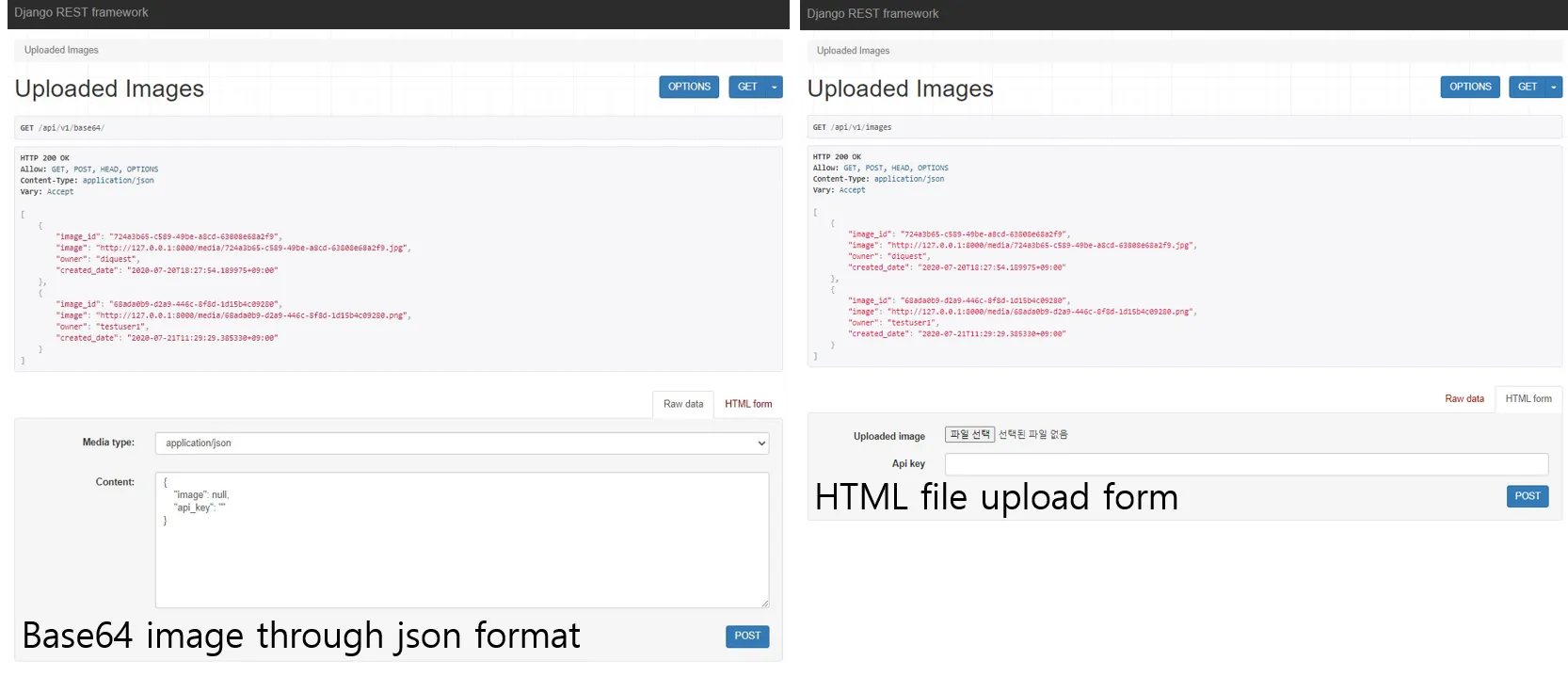 post_base64도 마찬가지로 127.0.0.1/8000/api/v1/images에 post reqquest를 하는 경우, 이에 base64 encoded image가 들어오는 것으로 간주하고 이를 decode한 후, django의 ContentFile method를 이용하여 이미지화하고 저장합니다.
